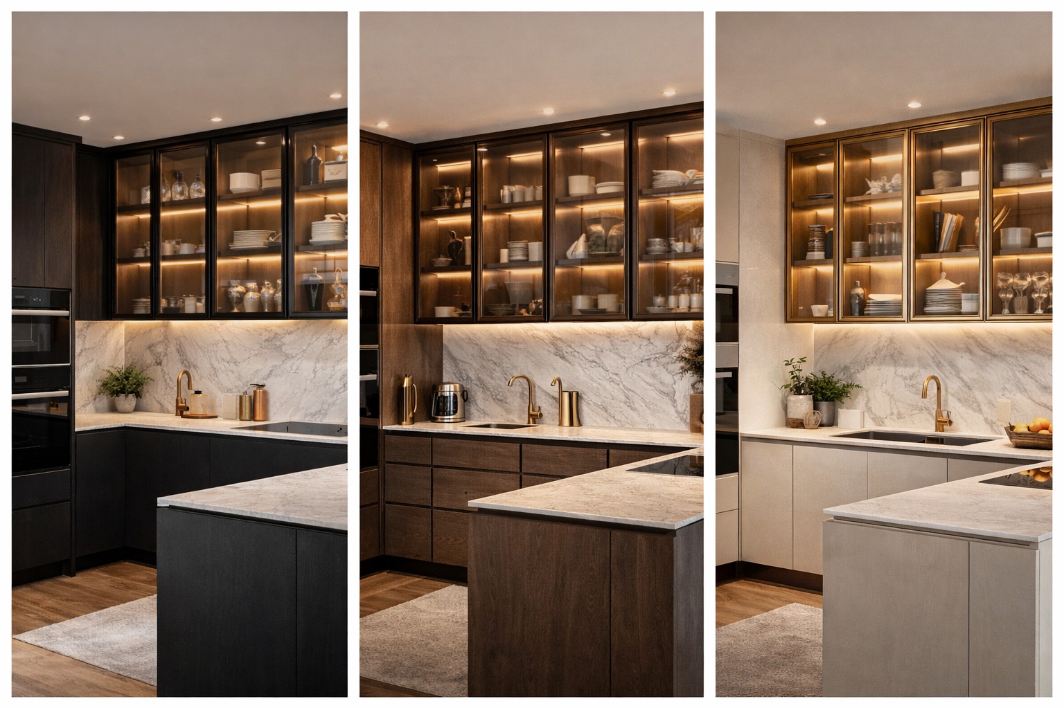 فریمهای باریک آلومینیومی همراه با شیشه باعث میشوند فضا بازتر و روشنتر دیده شود. این ویژگی در آشپزخانههای کوچک بسیار مهم است.
